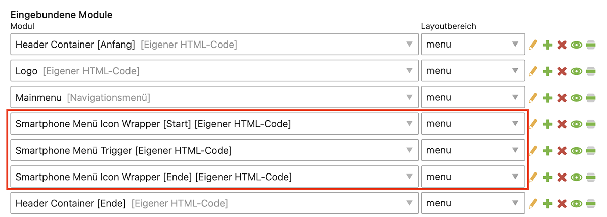 - Ändere im Bereich "Eingebundene Module" den Layoutbereich den entsprechenden Modulen von menu zu Kopfzeile