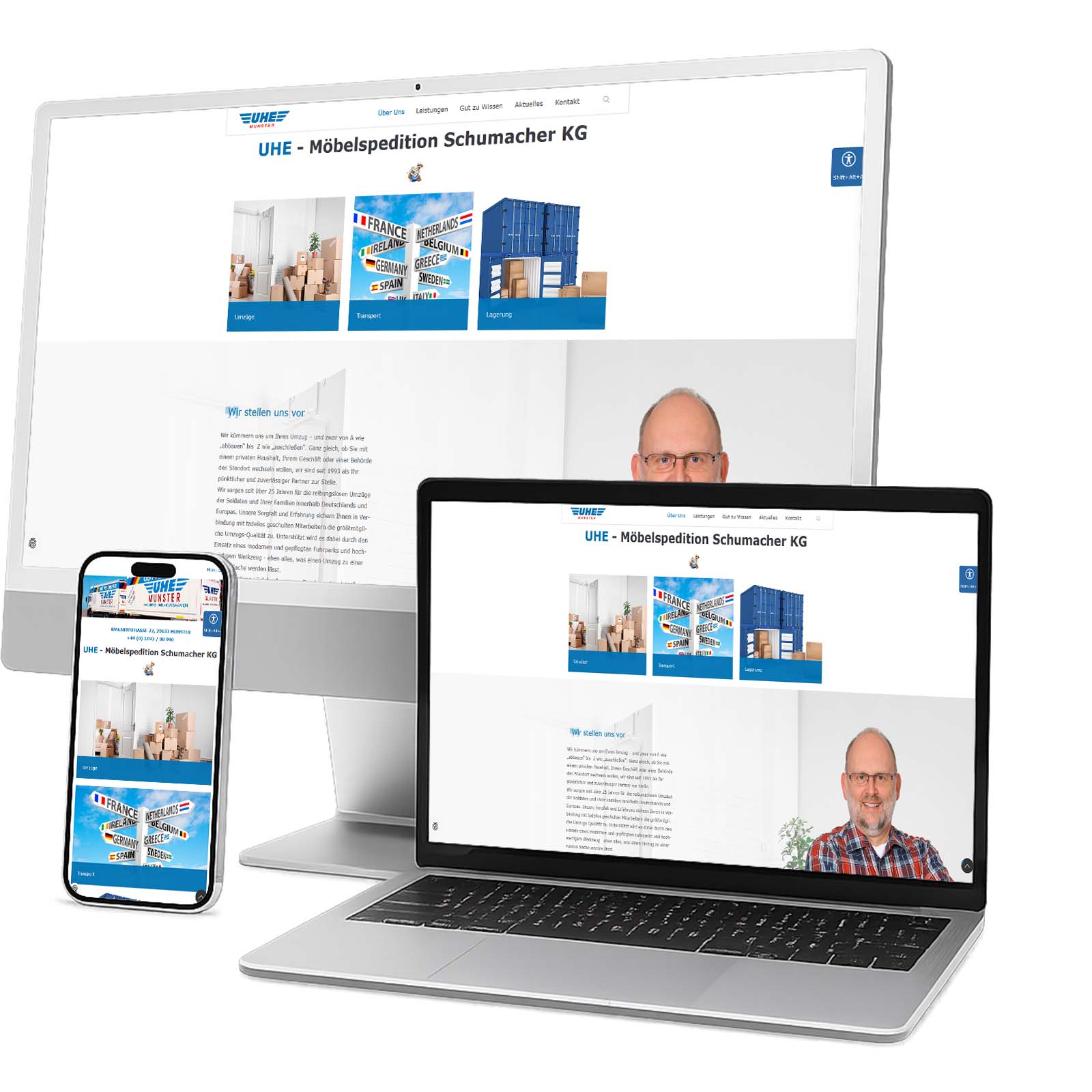 Herr Schumacher beauftragte mich mit der Neugestaltung seiner bisherigen Website für die UHE Möbelspedition Schumacher KG in 29633 Munster. Die bestehende Website war nicht mehr zeitgemäß, wurde auf mobilen Endgeräten nicht ordentlich dargestellt und es fehlte jede Menge Inhalt. Diese bestehenden Mängel waren abzustellen und dazu sollte die neue Website ein modernes responsive Design erhalten. Eine selbstständige Pflege und Wartung wurde ebenfalls ermöglicht.